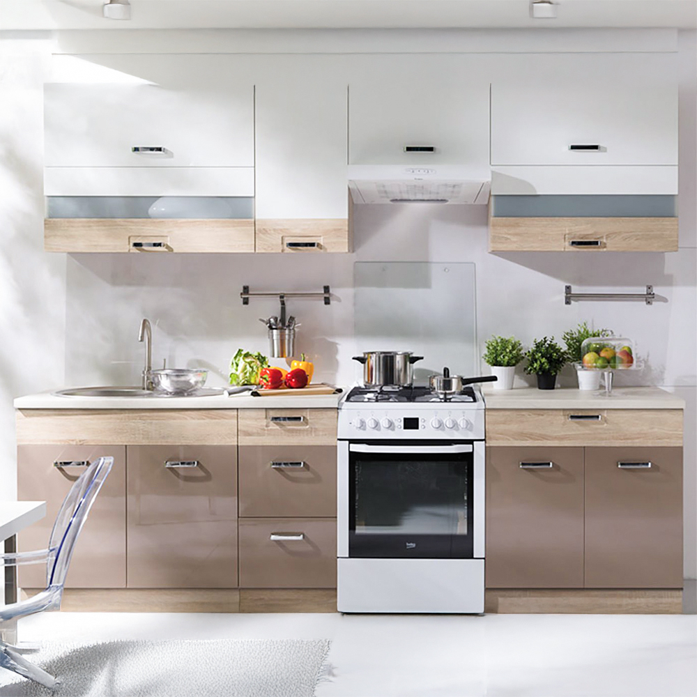 Bucătărie modulară Premio este o este o soluție elegantă și practică pentru orice locuință modernă. Realizată din PAL melaminat și MDF lucios, oferă corpuri suspendate și inferioare configurabile, cu finisaje în nuanțe calde precum alb, cappuccino și sonoma. Sistemele de închidere silențioasă cu amortizare adaugă confort și durabilitate. Configurațiile versatile permit amenajarea în linie, în L sau U, adaptându-se perfect spațiului disponibil.