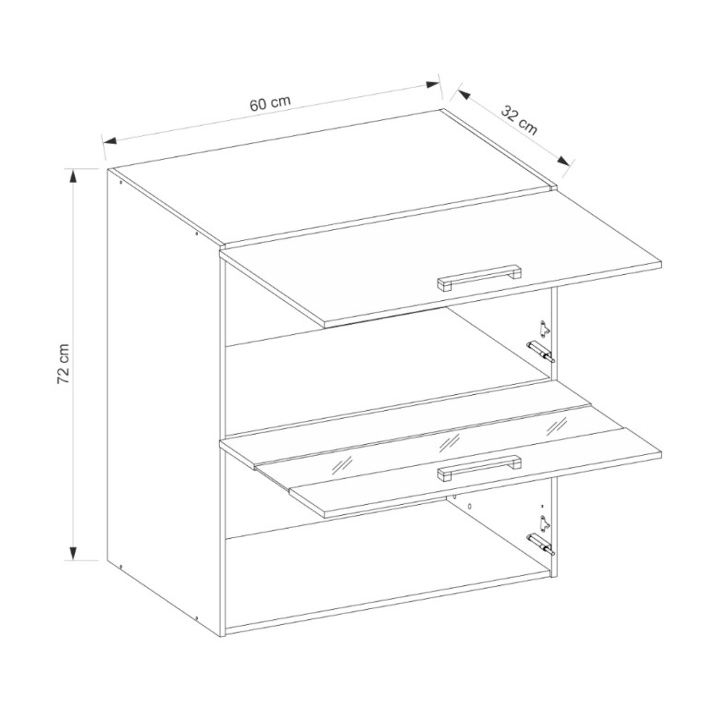 Dulap suspendat cu 2 usi, din colecția Glamour, GLA-40G impresionează prin liniile sale elegante și finisajele moderne, fiind ideal pentru interioare sofisticate. Dulap de perete cu lățime de 60 cm cu 2 uși care se deschid în sus. Ușă inferioară cu sticlă,