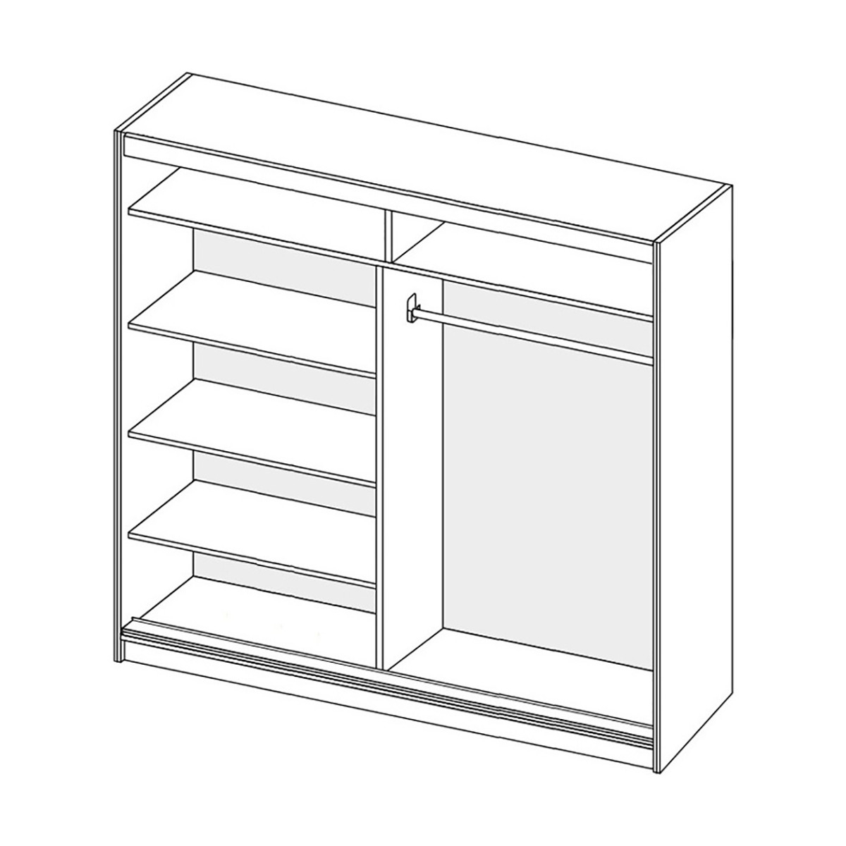 Dulapul EFFECT are 5 rafturi, o bară de haine și o oglindă pe una dintre ușile glisante, latime 200 cm.