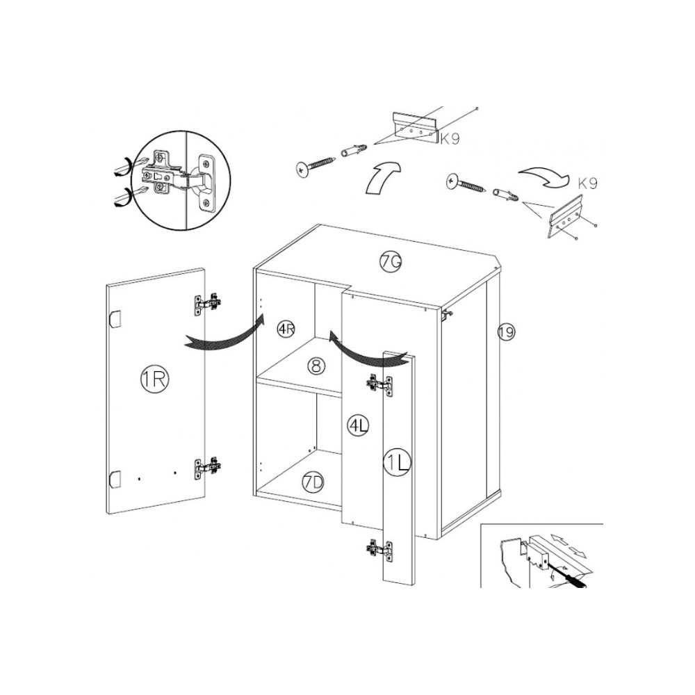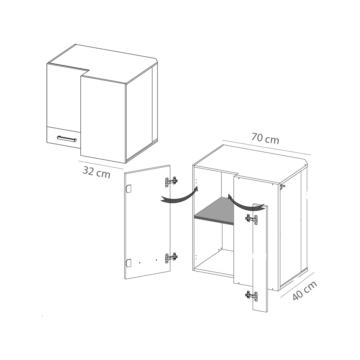 Dulap suspendat pe colt, 70x40 cm, cu un raft în interior.